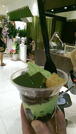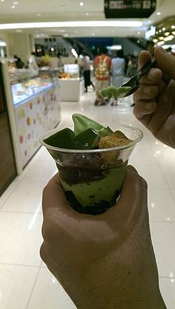 主角溫和不苦澀的抹茶霜淇淋單吃或搭配紅豆泥都十分對味, 兩顆Q度十足的湯圓增加口感, 最下層為輕爽的綠茶凍.