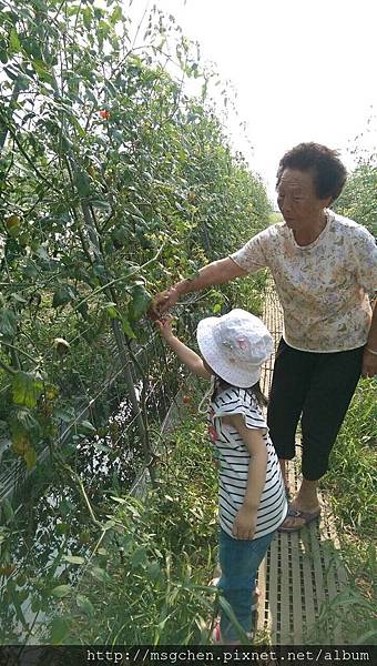 郭奶奶指導我們,採摘番茄時要連蒂頭折斷,這樣可以保存較久喔!