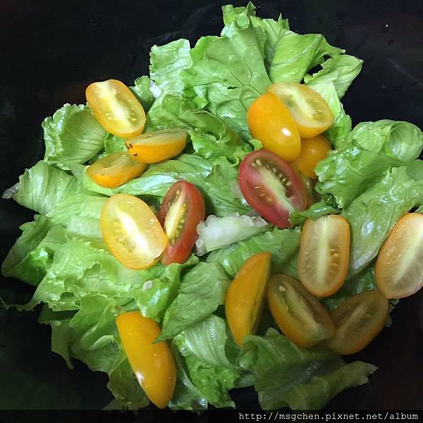 一、沙拉: 本事農莊有機番茄、有機綠寶石萵苣、凱薩醬、麵包屑
