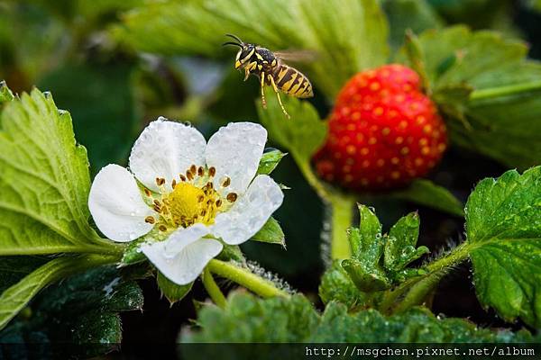 溫室採用高成本的蜜蜂授粉自然農法,採草莓的同時,有時會見到工作中的蜜蜂~~